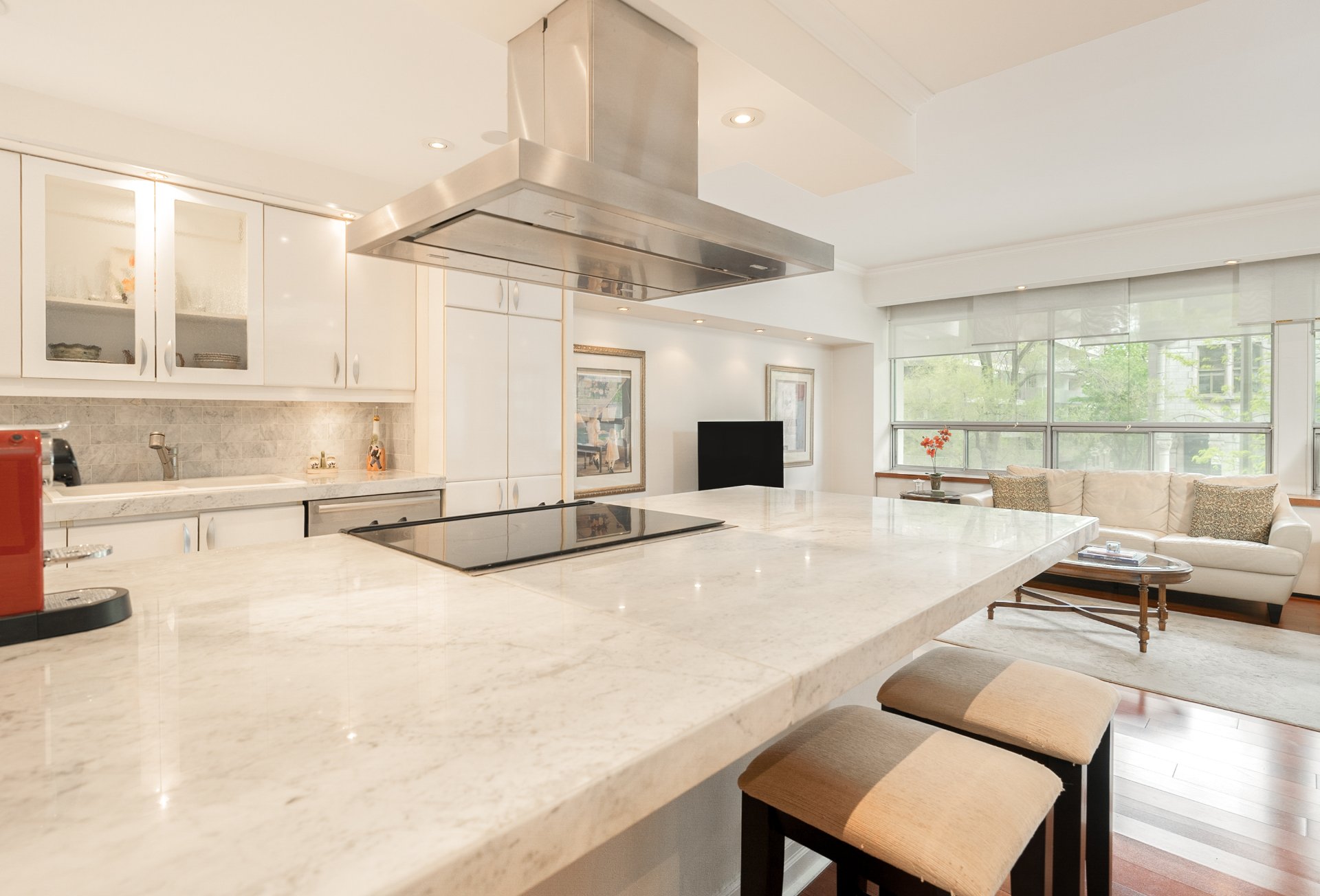 Beautifully appointed condo in the prestigious Golden Square Mile. Ideally located near Percy Walters Park, steps to Mount Royal, museums, fine dining, shopping, and public transportation. Easy walk to McGill and Concordia. This bright unit features warm Brazilian wood floors and an open-concept living space with a spacious dining area--perfect for entertaining--plus a renovated kitchen with marble counters. Amenities include a gym, meeting room, and a stunning outdoor pool with landscaped garden and terrace--a true urban haven. Experience the refinement and ease of downtown living at its finest. 24/7 concierge, gym, meeting room, pool.
